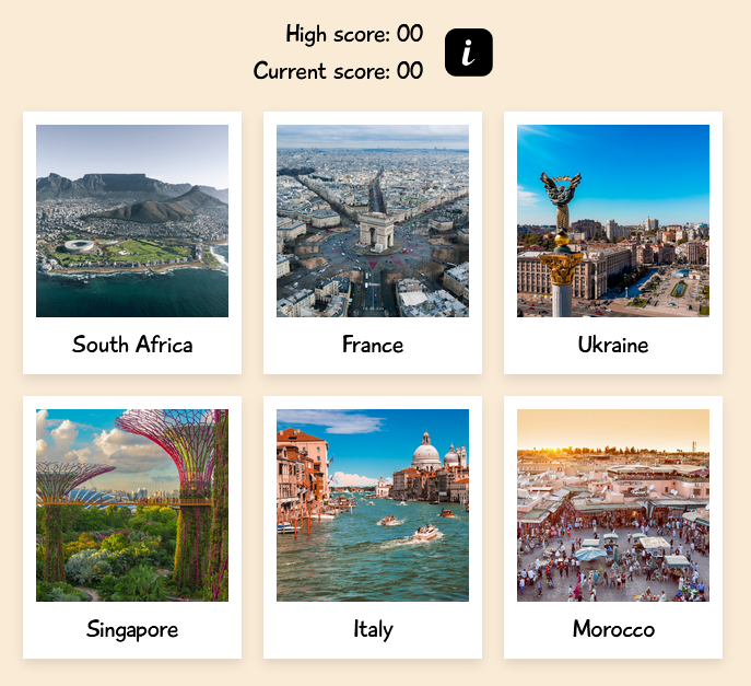 Game made in React as part of The Odin Project React Curriculum. Click on unique country images to score points and win!